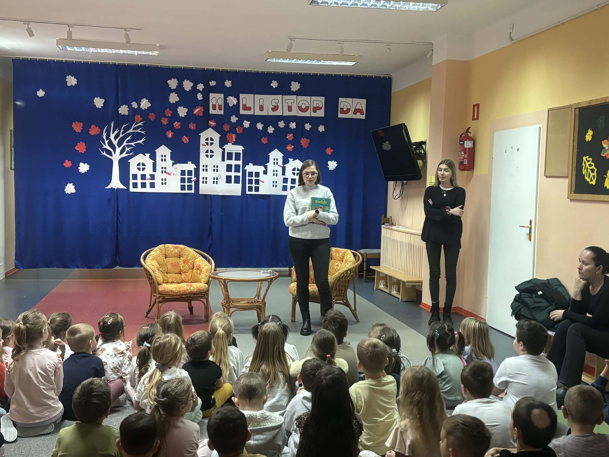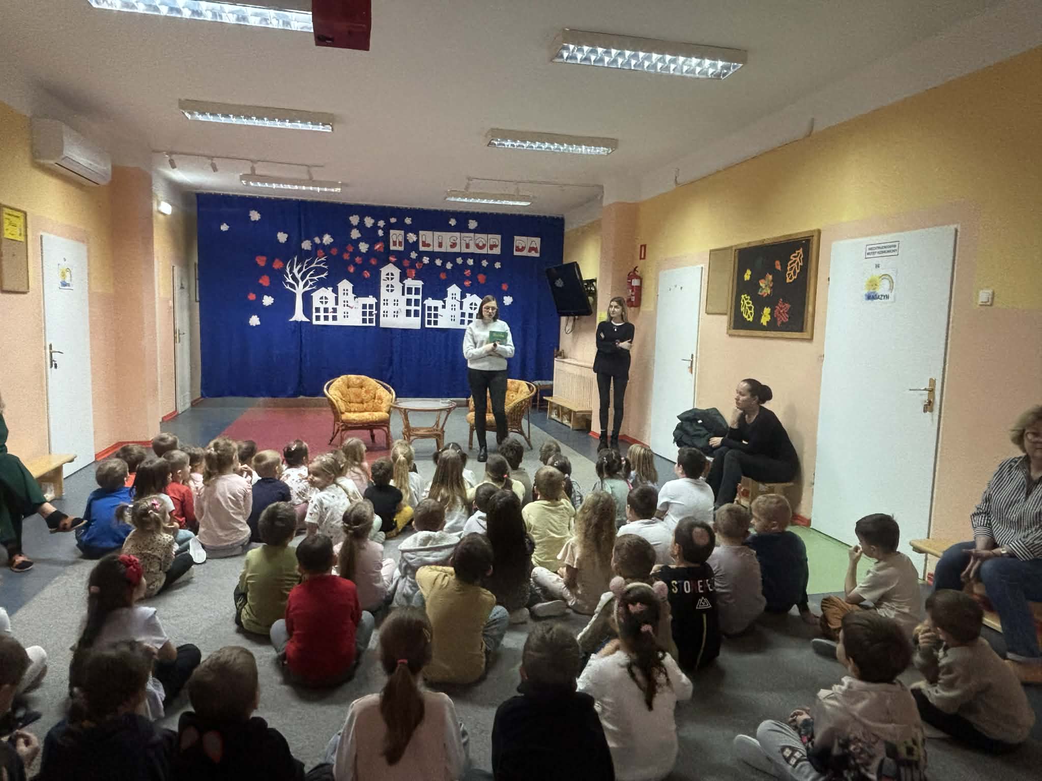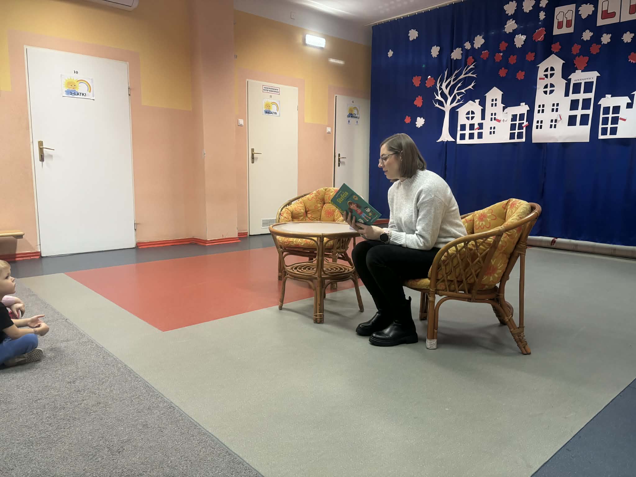 W ramach akcji #CałaPolskaczytadzieciom nasze przedszkole odwiedziła dziś Miejska Biblioteka Publiczna im. W. Reymonta. Pani bibliotekarka przeczytała dzieciom książkę autorstwa Aleksandry Struskiej - Musiał "Stefcia wybiera buty". Przedszkolaki z zaciekawieniem wysłuchały opowiadania.