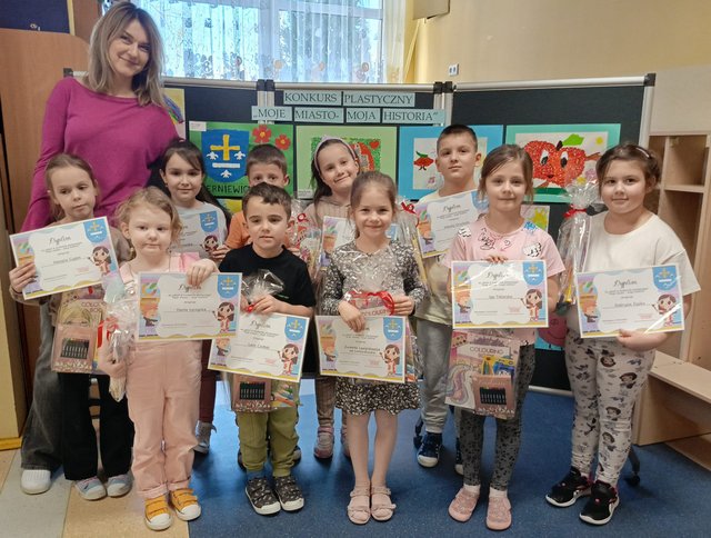 W naszym przedszkolu odbył się konkurs plastyczny pt. „Moje miasto – moja historia”. Celem konkursu jest kształtowanie właściwego stosunku do swojej miejscowości, wskazanie różnorodności piękna miasta, wzbudzanie u dzieci uczuć patriotycznych. Przedszkolaki wykazały się twórczą postawą dla historii i przyrody własnej miejscowości. Zaprezentowały za pomocą różnych technik plastycznych ważne miejsca związane z miejscem zamieszkania. Ukazały piękno naszego miasta - Skierniewice. Konkurs cieszył się dużym zainteresowaniem wśród przedszkolaków, co zaowocowało dużą ilością wykonanych prac plastycznych.