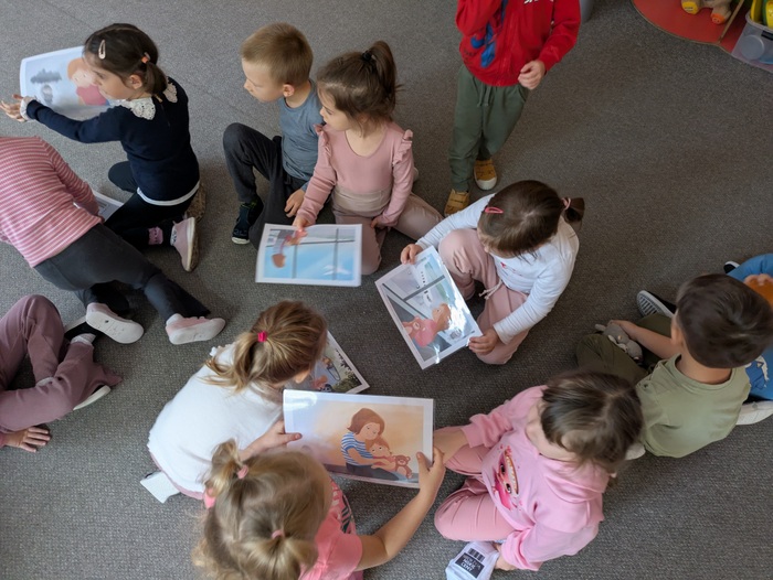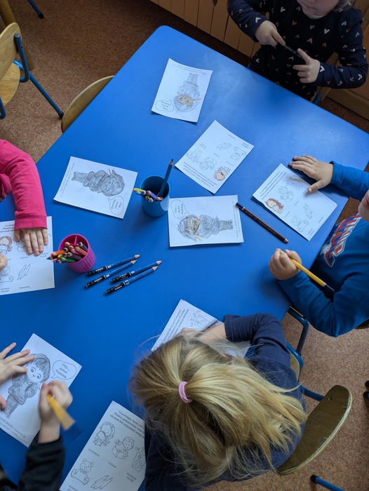 Dzisiaj poznaliśmy kolejnego bohatera z serii Czuciaki, był nim Markotek. Pojawia się zawsze, kiedy ogarnia kogoś smutek, w tym przypadku z wyjazdu dziadka. Opowiadaliśmy o tym co może nas zasmucić a także jak radzić sobie ze smutkiem. Dzieci chętnie układały elementy historyjki a następnie kolorowały Markotka.