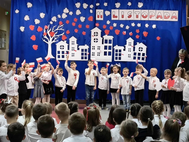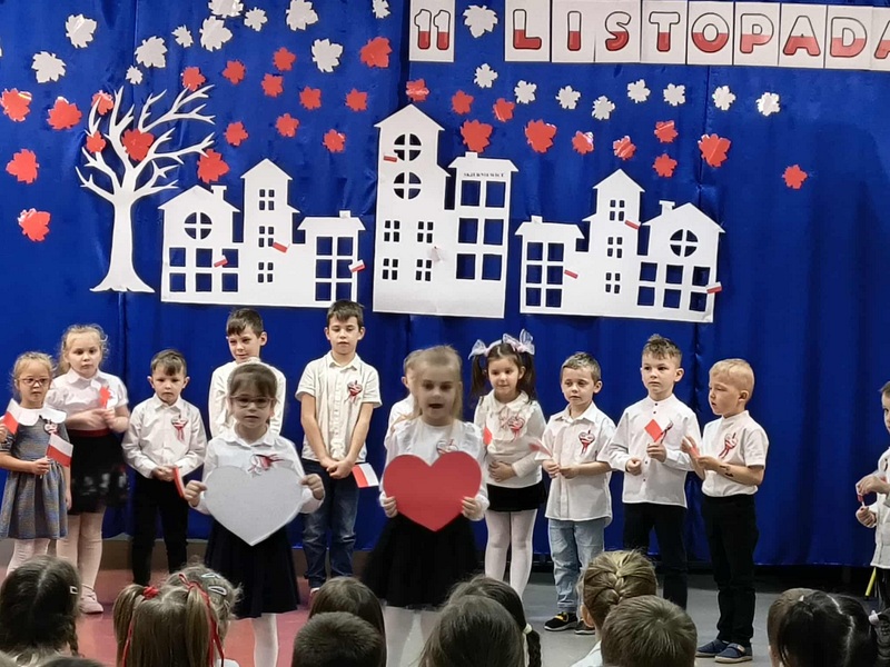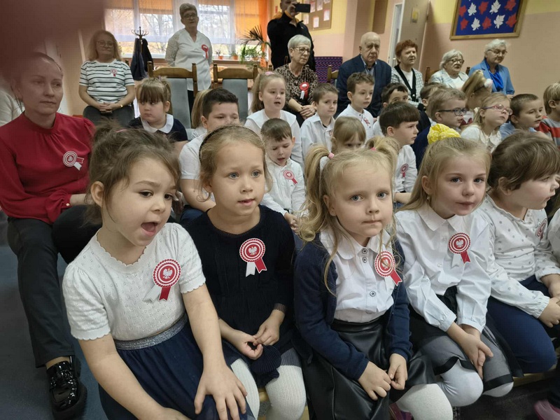 W piątek, 7 listopada w naszym przedszkolu odbyły się uroczyste obchody Dnia Niepodległości. Dzieci z grupy "Poziomki" z dumą zaprezentowały program artystyczny, w którym znalazły się wiersze i piosenki o tematyce patriotycznej. Wśród zaproszonych gości byli członkowie Klubu Seniora "Zgoda" a także emerytowani nauczyciele placówki, którzy z radością uczestniczyli w uroczystości. Wspólnie odśpiewano hymn państwowy - "Mazurek Dąbrowskiego". To spotkanie pokoleń stało się piękną lekcją patriotyzmu, wzajemnego szacunku i wdzięczności za wolność.