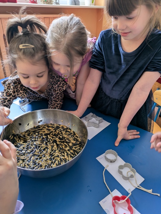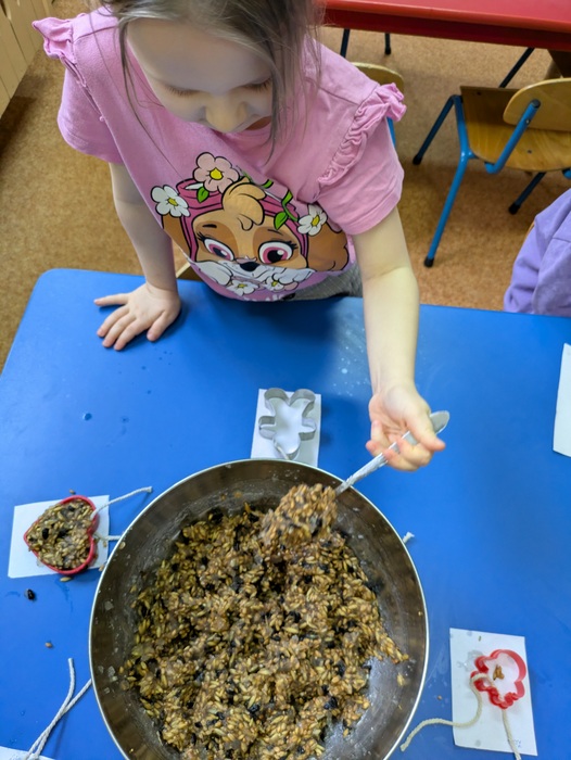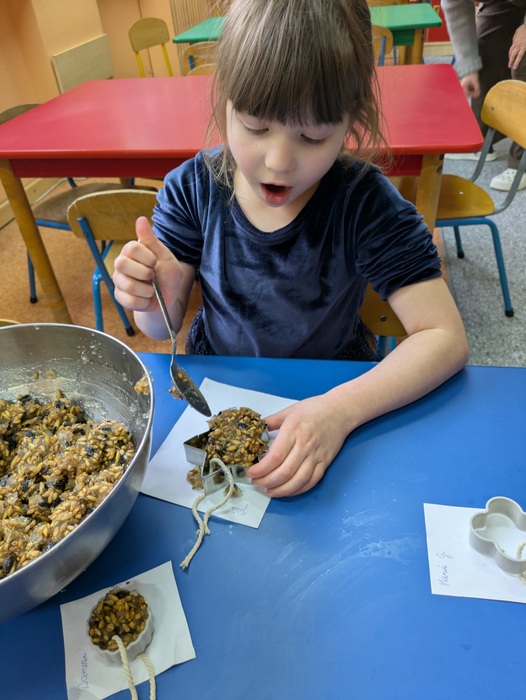 Zima to pora roku, kiedy należy pomagać zwierzętom, a zwłaszcza ptakom, przetrwać ten trudny czas. Ziemia jest zamarznięta, pokryta śniegiem lub lodem, przez co w znaczący sposób ogranicza ptakom dostęp do pokarmu. Dokarmianie ptaków staje się często jedyną szansą na przetrwanie kilku ciężkich miesięcy. Jeżyki wykazując się wielką troską o los ptaków w czasie zimy, podjęły się zadania przygotowania pokarmów dla skrzydlatych przyjaciół. Przed przystąpieniem do pracy utrwaliły nazwy ptaków, które pozostają u nas na zimę. Nauczyli się, jak mądrze dokarmiać skrzydlatych przyjaciół oraz zdobyli wiedzę, jakie ziarna są przysmakiem dzikich ptaków. Na koniec wykonaliśmy galaretkowe zawieszki dla ptaków.
